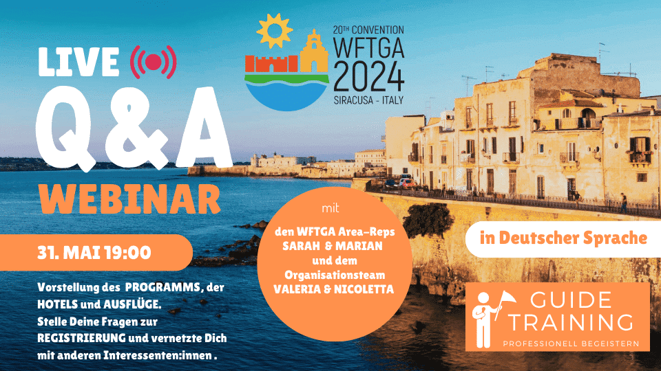 Wir haben gemeinsam mit den WFTGA Area-Reps Sarah und Marian dieses Meeting speziell für die deutschsprachigen Gästeführer:innen und Fremdenführer:innen aus Deutschland, Österreich und der Schweiz geplant.